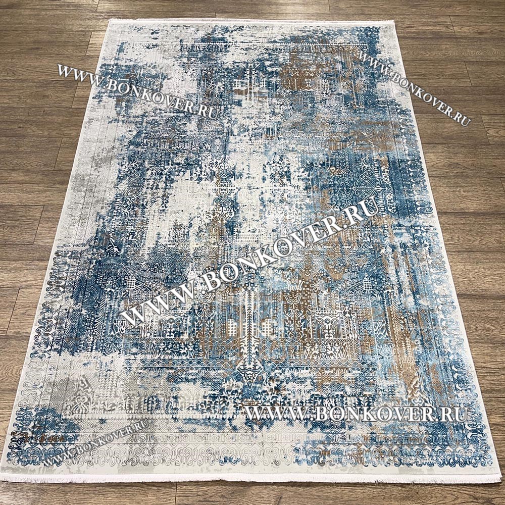 Элегантный Высокоплотный Премиальный Ковер из вискозы Дизайн 02 Голубой с Бежевым наполняет интерьер гостиной теплом и уютом, гармонично сочетает в себе изящество и стиль. Он соткан из высококачественного сырья, прочный и долговечный.